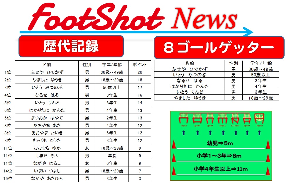 正式ルールサイズや形状の異なる7種類のミニゴールに対して7球ボールを蹴り、ゴールインにより獲得したポイント数を競います。